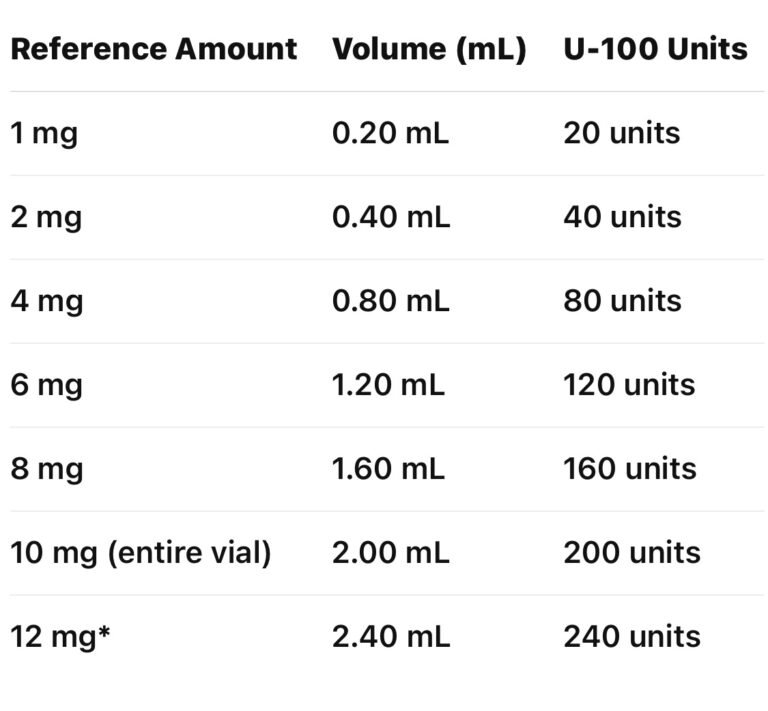 The table below reflects mathematical volume conversions only based on a 10 mg vial reconstituted with 2.0 mL BAC water (5 mg/mL concentration).